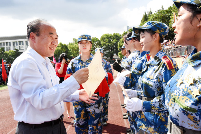 党委武装部对军训工作进行了总结汇报,副书记陈信、副校长王志恒分别宣读了军训期间评选出的优秀连队、优秀教官、优秀辅导员和优秀学员,孙培雷书记、胡晟校长、于怀同支队长、颜靖副政委为优秀代表颁奖。商学院宫乐同学和设计与艺术学院周逸薇同学作为军训优秀学员代表进行了交流发言,两校区参训部队首长分别总结了军训工作的总体情况,对同学们的优异表现给予了赞扬。校党委书记孙培雷代表学校全体师生向承训部队赠送了锦旗。