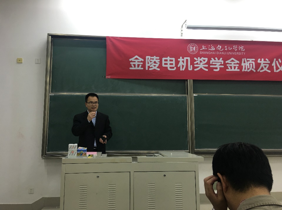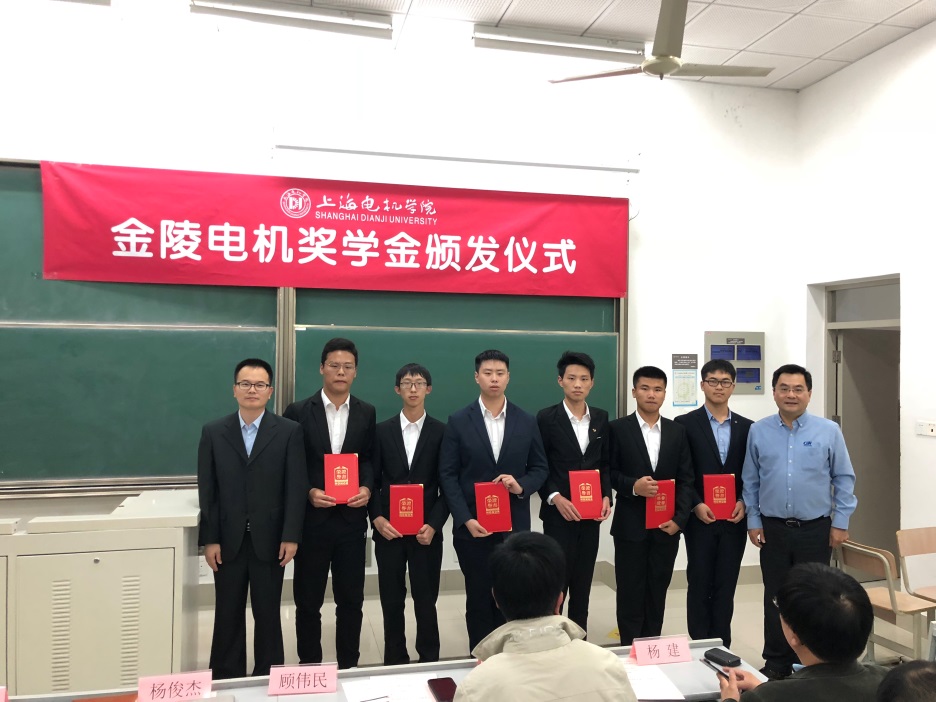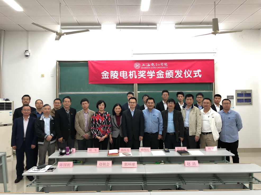 10月23日晚,我校在B教105举行了“金陵电机奖学金”颁发仪式。上海金陵电机股份有限公司董事长顾伟民、副总经理杨建、总工程师徐须诚、设计部经理赵清,我校副校长杨俊杰、党政办主任董雪静、教务处处长刘军、电机电器智能化专业负责人赵朝会、研究生处副处长郭环球、电气学院院长陈国初等应邀出席颁奖仪式。电气学院电机系全体教师及2017级、2018级电机电器智能化专业学生参加了仪式。仪式由陈国初主持。