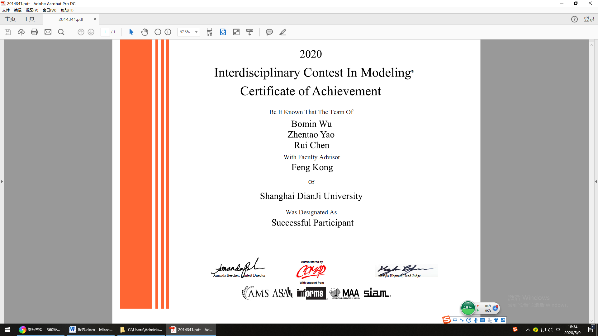 近日,2020年美国大学生数学建模竞赛(MCM/ICM)评审结果正式公布。商学院经济与金融专业吴伯旻、陈蕊两位同学与吉林大学姚振涛同学组队参赛,获得交叉学科(ICM)国际三等奖(S奖),指导教师为商学院孔峰老师。