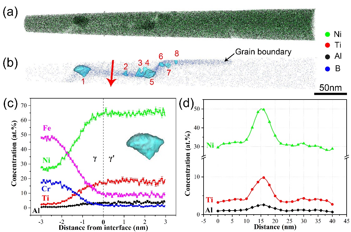 图1. (a-b)锯齿晶界APT三维空间分布图;(c)析出相组分近邻直方图;(d)基体与晶界Ni,Ti和Al一维浓度分布图