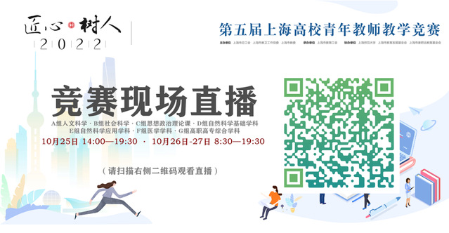第五届上海高校青年教师教学竞赛决赛将于10月25日-10月27日在上海师范大学拉开帷幕。今年的青教赛将以现场直播的方式对外发布,可扫描以下二维码观看: