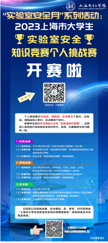 为进一步加强实验室安全教育,提高学生实验室安全意识,增强安全事故应急处理能力,按照上海市教委和学校的部署要求,现决定组织开展“实验室安全月”系列活动——“2023上海市大学生实验室安全知识竞赛”活动,请各相关部门、学院积极组织本专科、研究生关注公众号并参加个人挑战赛(日赛、周赛、月赛、总决赛),个人成绩优异者将代表学校参加“2023上海市大学生实验室安全知识竞赛(团体赛)”,详情请关注海报及公众号(参赛请加入QQ群)。