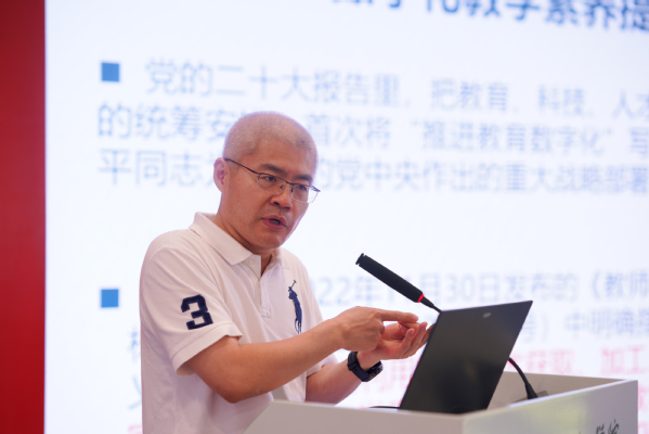 复旦大学蒋玉龙教授作“建课、用课、管课-全面数字化教学模式设计与实施”的主题报告,创造性地提出了一种数字化建课、用课、管课的新型教学模式——“原位翻转课堂”,在教育数字化的大背景下,为数字赋能课堂教学提供了一种有效的改革模式。