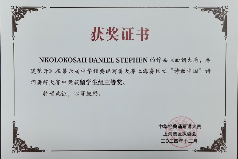 软件2213 班的国际学生NKOLOKOSAH DANIEL STEPHEN(中文名海洋),凭借对《面朝大海,春暖花开》的生动讲解,荣获“诗教中国”诗词讲解大赛留学生组三等奖。《面朝大海,春暖花开》是一首充满希望与温暖的诗歌,海洋同学深入挖掘作品内涵,用富有感染力的语言,将海子这首经典诗歌中的温暖与希望传递给每一位观众。他的讲解仿佛带领大家走进了一个充满诗意的世界,让人们感受到了大海的广阔与春天的美好。