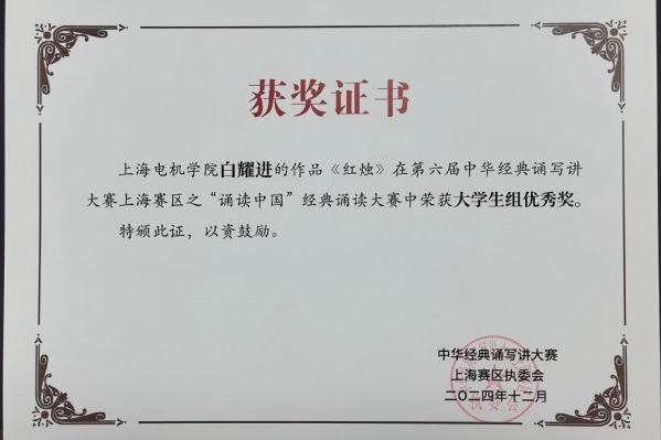 近日,教育部公布了第六届中华经典诵写讲大赛结果,我校学子在“诗教中国”诗词讲解大赛中喜获上海赛区留学生组三等奖1项,在“诵读中国”经典诵读大赛中喜获上海赛区大学生组优秀奖1项。