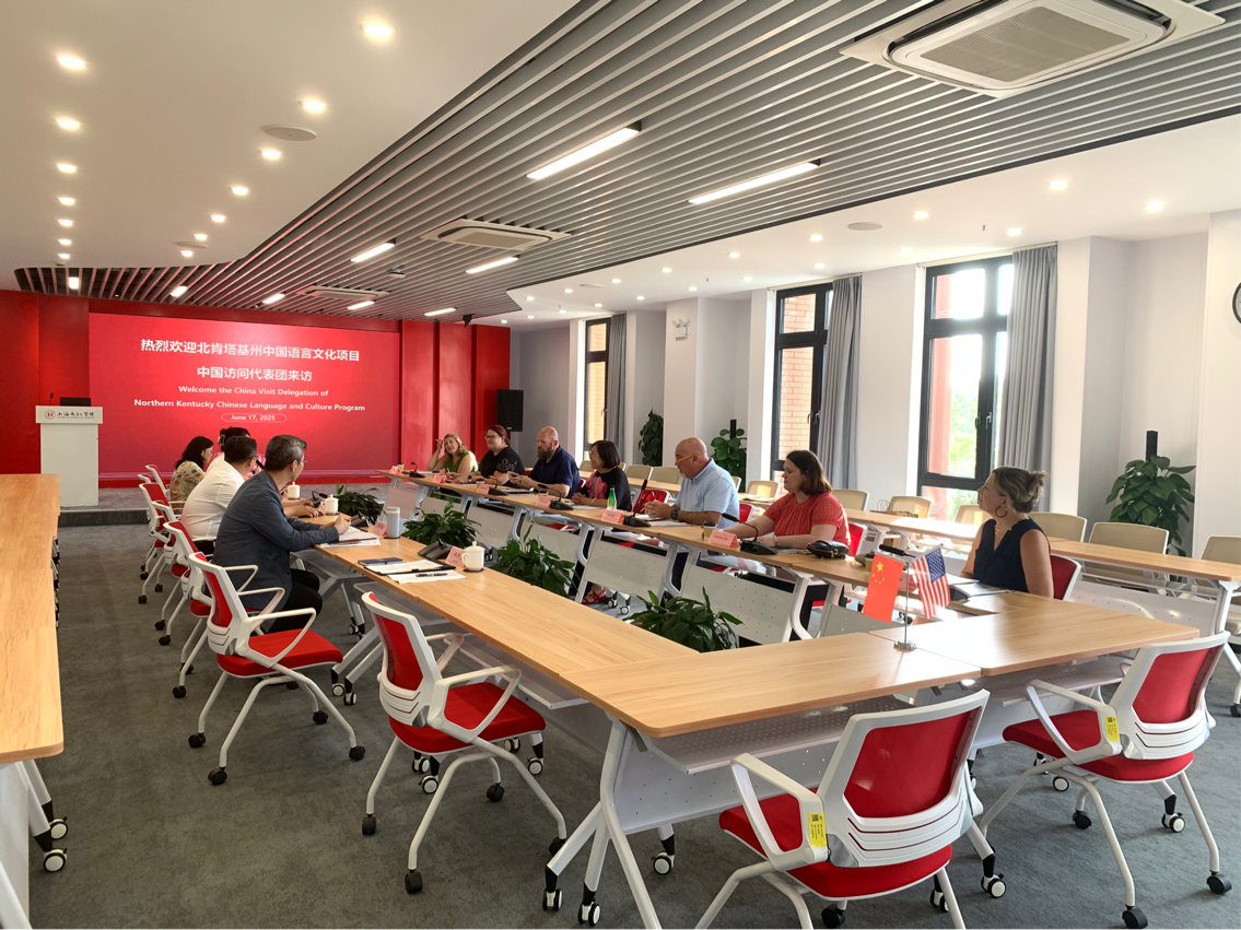 美国北肯塔基州中国语言文化项目代表团团长Huajing Maske教授对学校的热情接待表示感谢,并详细介绍了代表团成员及北肯塔基教育联盟的发展情况。代表团成员Beechwood学区总监Mike Stacy教授介绍了北肯塔基州中国语言文化项目的运行经验,该项目旨在通过语言文化教育促进当地学生对中国文化的理解,培养具有全球视野的新时代人才。