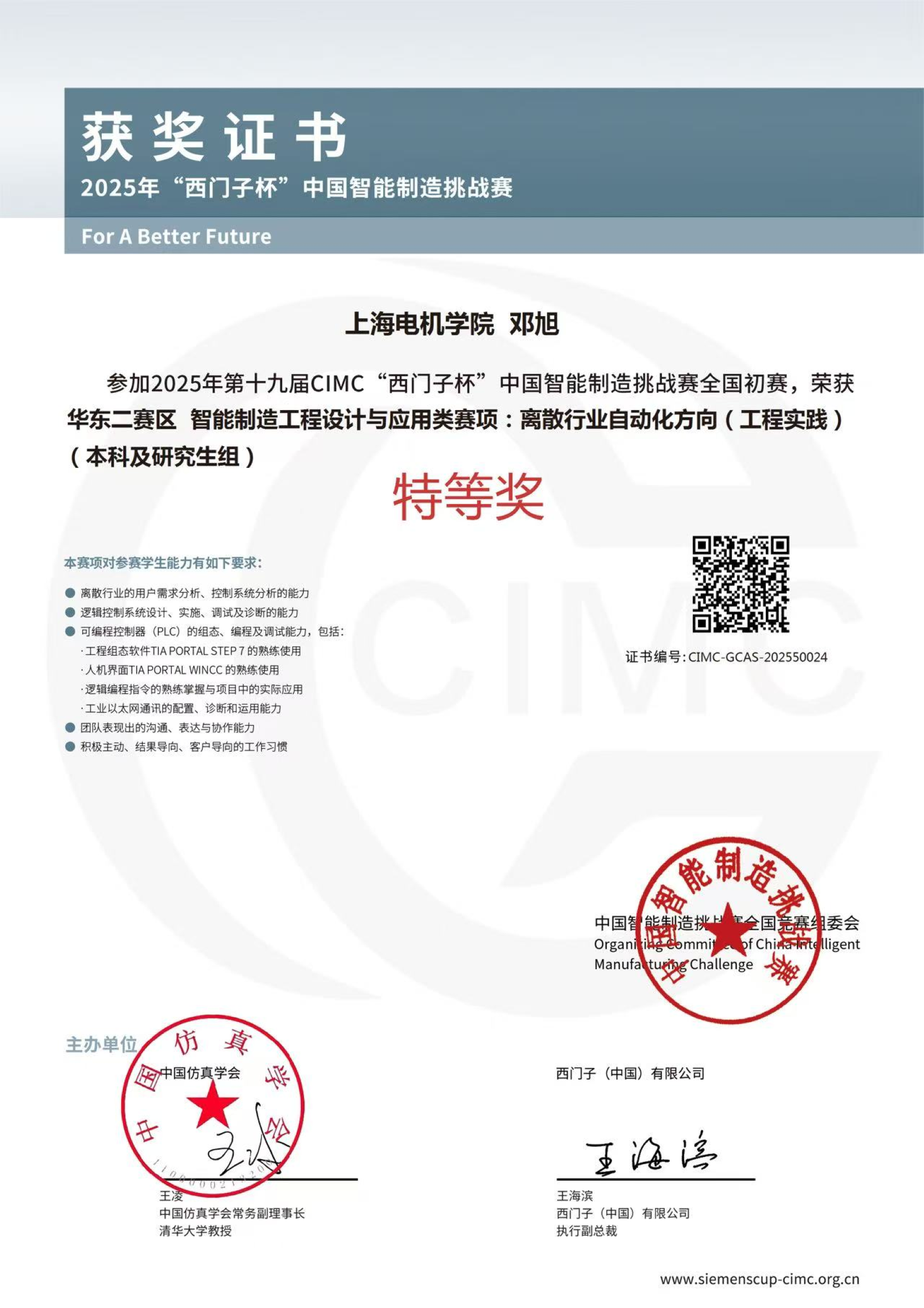 电机学子在2025年第十九届CIMC“西门子杯”中国智能制造挑战赛华东二赛区比赛中荣获特等奖