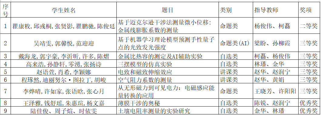 近日,2025年第二届上海市大学生物理实验竞赛(创新)公布,由我校文理学院教师指导的学生团队获得二等奖1项,三等奖6项,优秀奖2项。具体获奖名单如下: