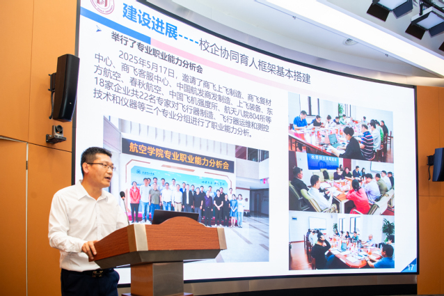 航空学院院长李雷详细介绍了学院成立一年来的建设进展与未来规划。过去一年,学院围绕“航空航天智能制造与运维”核心定位,完成了以航空宇航制造工程为龙头的学科专业布局,开设飞行器制造工程、飞行器运维工程、测控技术与仪器三个本科专业。在师资建设上,形成了“学术带头人+青年骨干教师+产业型教师+企业兼职高层次人才”的四元结构,并搭建了校企协同育人框架。