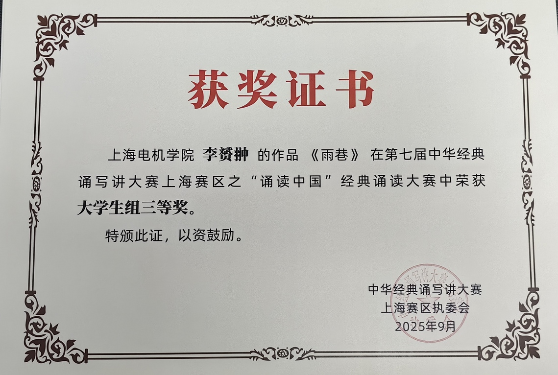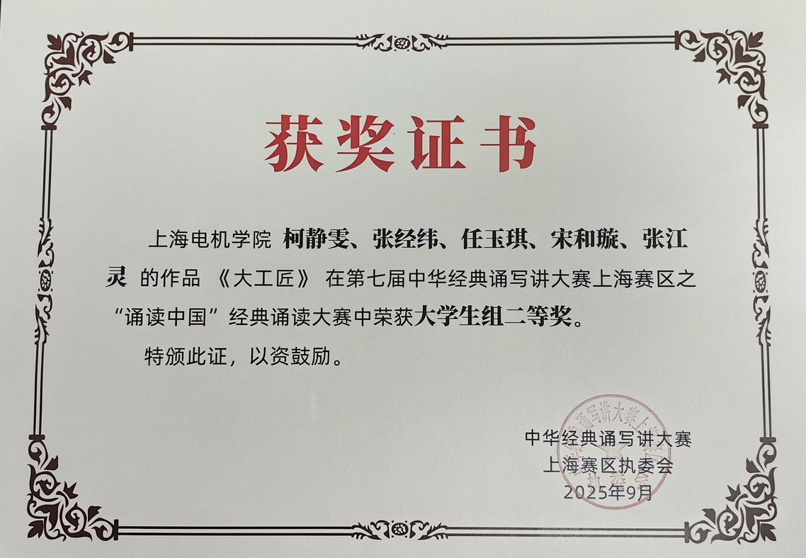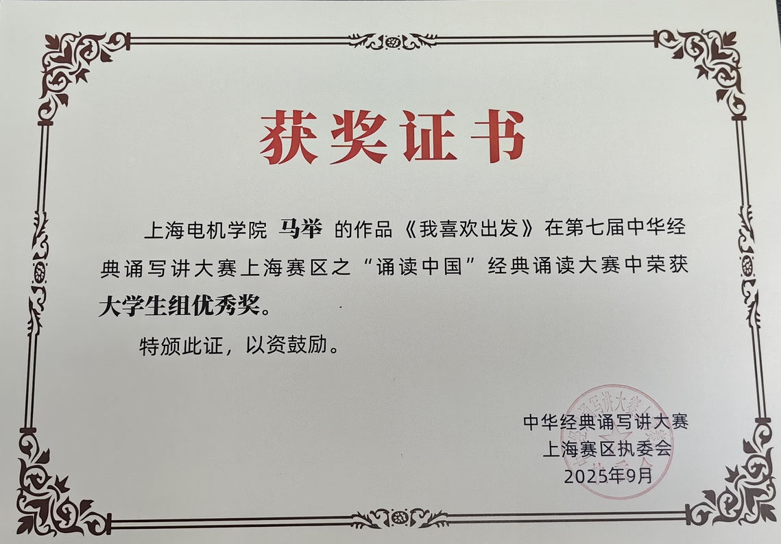 近日,第七届中华经典诵写讲大赛上海赛区之“诵读中国”经典诵读大赛评选结果揭晓。上海电机学院学子凭借出色的表现和深厚的诵读功底,在比赛中脱颖而出,共荣获二等奖一项、三等奖一项、优秀奖一项。