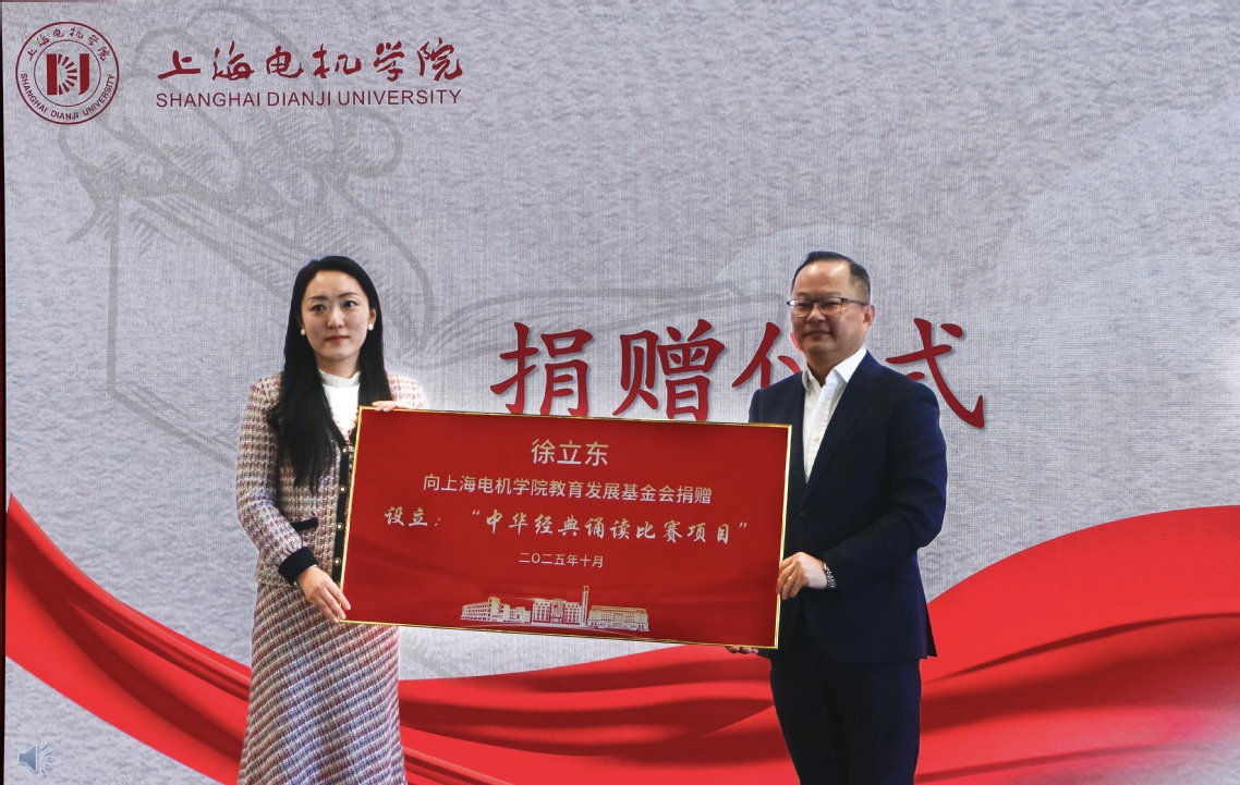 作为学校育人事业的坚定支持者,徐立东校友回顾了自己在校的求学生活,分享了个人的诵读故事与经历和传承中华传统经典对于个人发展的见解,并详细讲述了自己支持学校美育发展的初心,希望通过向学校教育发展基金会捐赠设立“中华经典诵读”项目助力学校人才培养工作。上海电机学院教育基金会副秘书长谢燕代表基金会接受捐赠,为社团活动开展提供坚实保障。