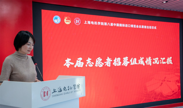 校团委书记钱斌在介绍本届进博会志愿者招募组成情况,特别提及周涟漪、胡骏烨、基米尔、梁爽等优秀志愿者代表,他们将分别在文创馆宣传、展务咨询、人文交流、长期管理岗上发挥专长,展现电机学子风采。