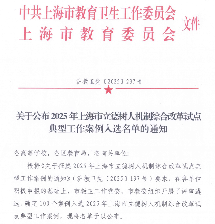 近日,中共上海市教育卫生工作委员会、上海市教育委员会公布了2025年上海市立德树人机制综合改革试点典型工作案例入选名单,我校申报的《上海电机学院“高校服务临港新片区就业育人联盟”产教融合实践》案例成功入选。