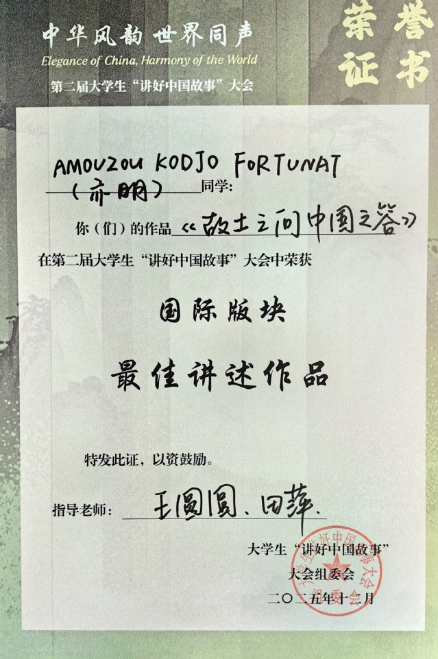 12月5日,第二届“中华风韵·世界同声”大学生“讲好中国故事”大会圆满落幕。我校文理学院带队参赛,来自多哥籍国际学生AMOUZOU KODJO FORTUNAT凭借作品《故土之问,中国之答》获得国际版块最高分,并荣获“最佳讲述作品”。