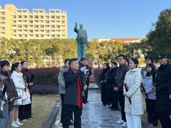 在铜像前,马克思主义学院院长刘炳辉为现场师生讲述毛主席鞠躬尽瘁为人民的伟大情怀,波澜壮阔的革命历程和为国家建设做出的丰功伟绩,他勉励青年学子,要从伟人精神中汲取奋进力量,将个人理想融入国家发展,在实现中华民族伟大复兴的赛道上接力奔跑,勇担使命。