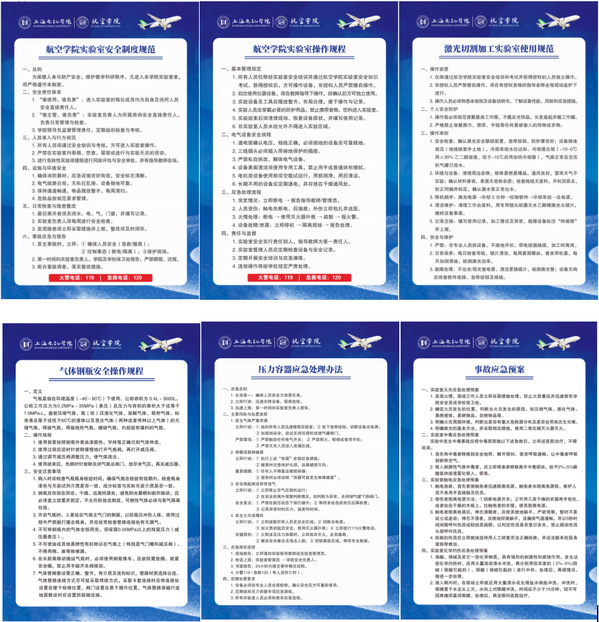 学院实验室中心针对航空制造与运维实验室、飞机钣铆实验室、航模创新实验室等11个不同功能的实验室,结合各实验室设备特性与潜在风险,精准制定实验室安全管理和使用规范、仪器设备操作规程、危险化学品管理办法、应急处置流程等安全管理制度28项。同时,精心制作包含基本管理规定、专项设备操作标准、应急处理流程等核心内容的安全操作规程展板60余块,明确激光切割加工、气体钢瓶、压力容器等专用设备的风险防控要求,实现所有实验室安全管理制度全覆盖、全上墙,切实将“安全第一,预防为主”的工作原则落到实处。