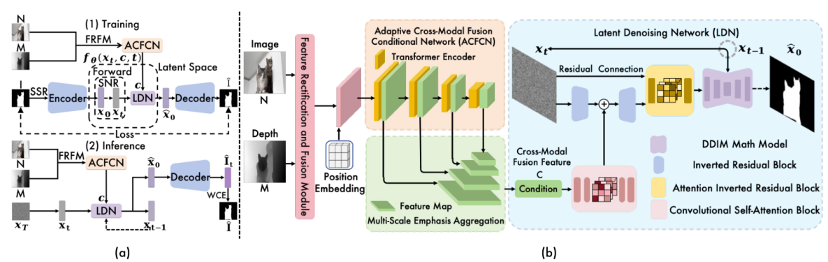 首先,自适应跨模态融合条件网络(ACFCN)通过引入跨模态引导功能来增强条件表达能力,而该特征是分割具有详细边界的显著目标的关键。其次,为训练和采样阶段设计了定制的学习调度和输出策略,包括信噪比驱动方差自适应(SVA)、稀疏结构重组(SSR)和加权置信集成(WCE)等。上述组件和策略与潜空间去噪网络(LDN)结合,能够充分利用扩散模型的优势,同时显著提升计算效率并减少参数空间需求。