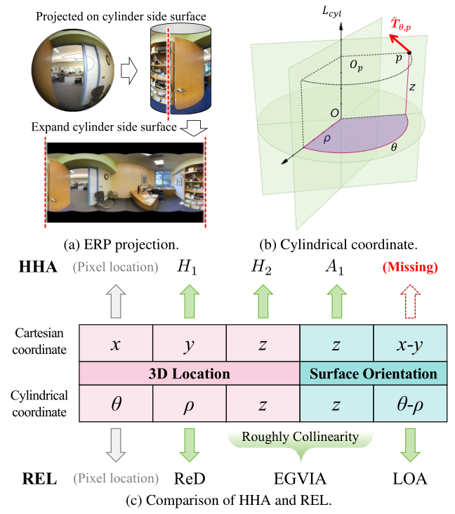 首先,基于柱坐标系提出了不依赖相机参数的REL深度表示,REL包含:表示平面距离的矫正深度(Rectified Depth, ReD)、融合了高度信息与表面法向量与重力方向的夹角的高程增益垂直倾角(Elevation-Gained Vertical Inclination Angle, EGVIA)以及建模表面法向量与圆柱切线之间的夹角的侧面取向角(Lateral Orientation Angle, LOA)。