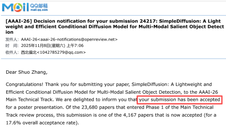 “SimpleDiffusion: A Lightweight and Efficient Conditional Diffusion Model for Multi-Modal Salient Object Detection”由张硕老师为第一作者,主要聚焦多模态显著目标检测(Multi-Modal Salient Object Detection, MSOD)领域。 多模态显著目标检测能够有效提升复杂场景下的显著目标定位能力,对医疗成像、机器人视觉和监控系统等实际应用具有重要意义。现有基于扩散模型的方法将MSOD视为由显著性特征引导的条件掩码生成过程,但常常忽略了Stable Diffusion的高计算成本和大尺度架构,导致与实际MSOD应用的不匹配。针对这些问题,本研究提出了首个不依赖Stable Diffusion的轻量化高效条件扩散模型SimpleDiffusion。