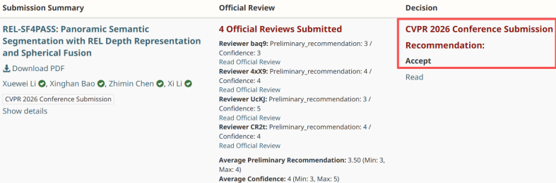 近日,电子信息学院在计算机视觉与人工智能领域取得新进展,首次以上海电机学院为第一单位录用CCF-A类会议成果。其中,励雪巍等人的成果“REL-SF4PASS: Panoramic Semantic Segmentation with REL Depth Representation and Spherical Fusion”被CVPR 2026 (CCF A类国际会议,谷歌学术热门出版物排名第二,仅次于Nature)录用;张硕等人的成果“SimpleDiffusion: A Lightweight and Efficient Conditional Diffusion Model for Multi-Modal Salient Object Detection”被AAAI 2026 (CCF A类国际会议)录用。同时,学院培养了以人工智能2022级本科生鲍星含为代表的一批深耕人工智能前沿的学生,并探索与中电科联海创智等领域内企业的合作。